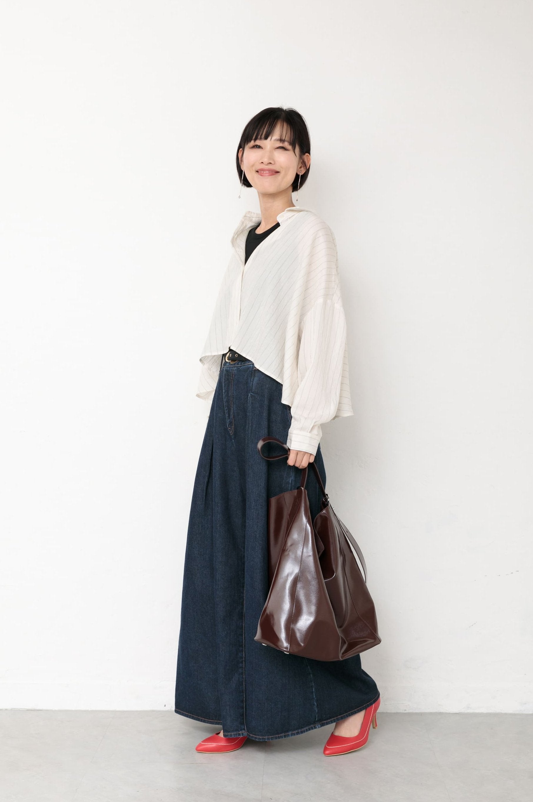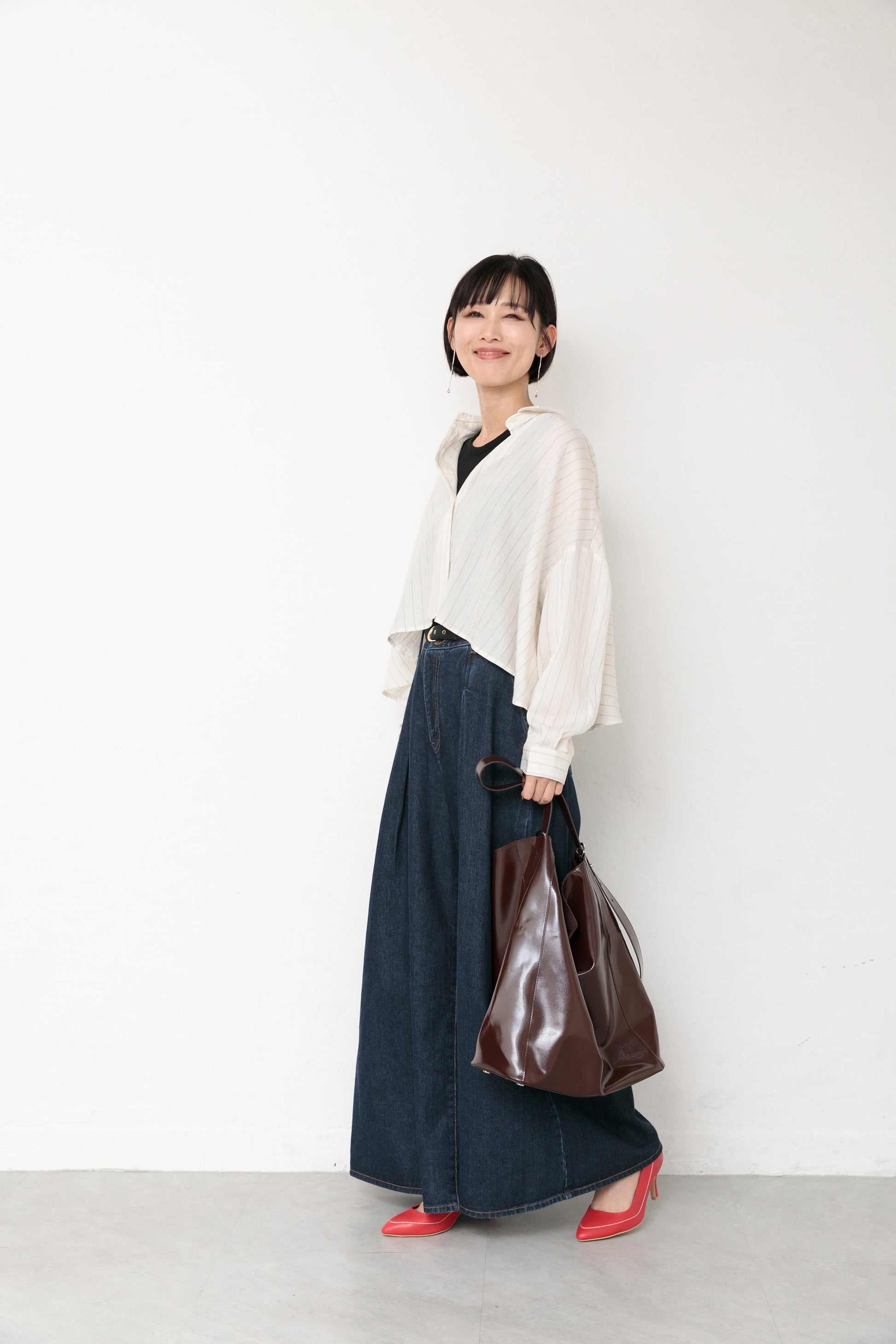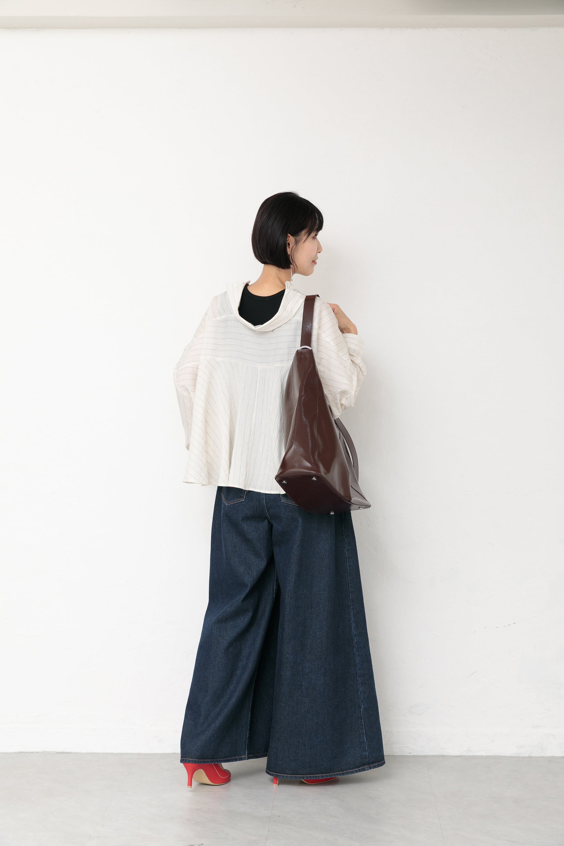 裾のたっぷりとしたボリュームと縦のシルエットで脚長効果抜群のアイテムに仕上がりました。