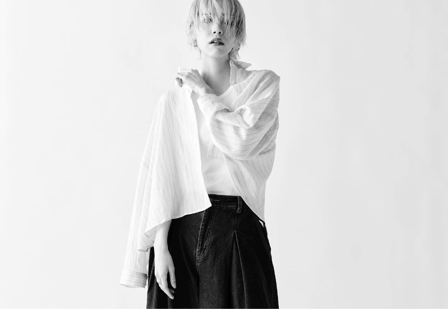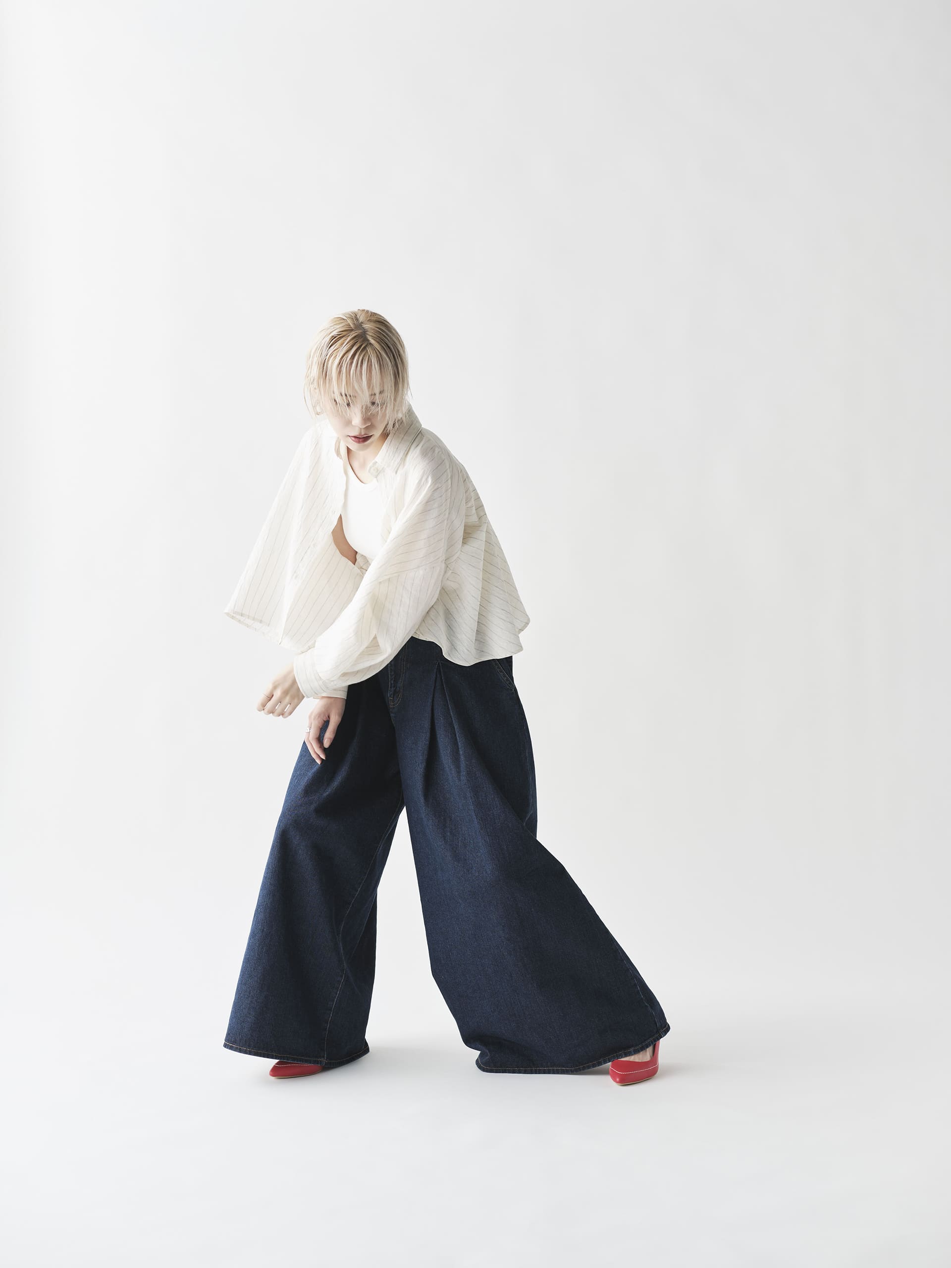 シャツは裾丈が短めでたっぷりと生地を使い揺れ感を楽しんで頂ける作りになっております。