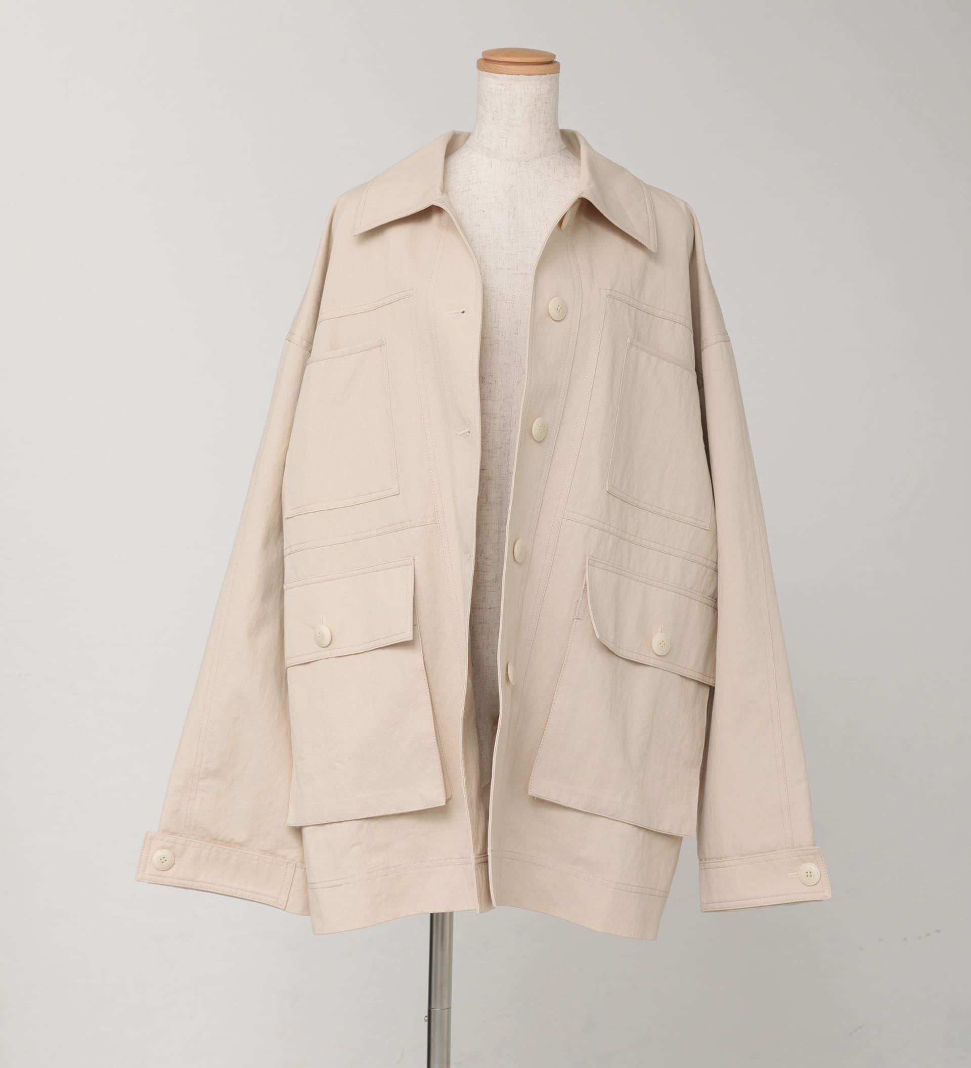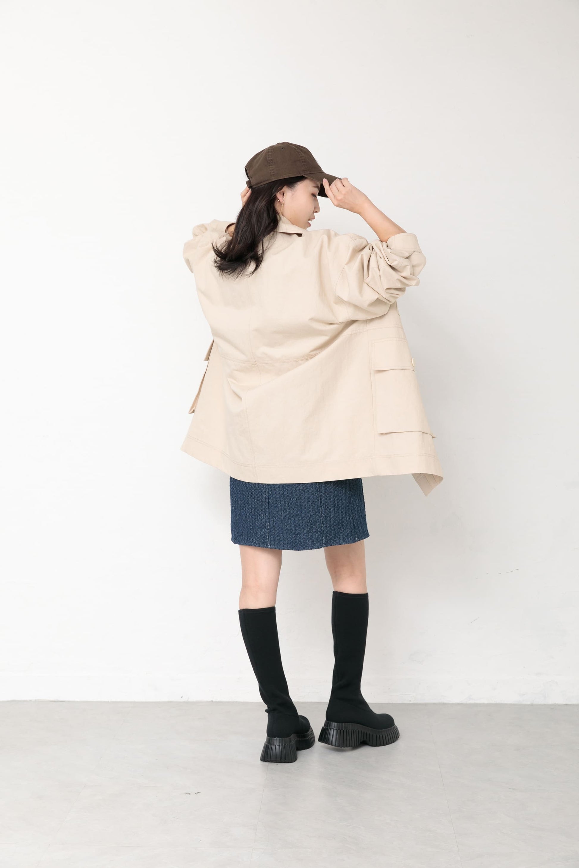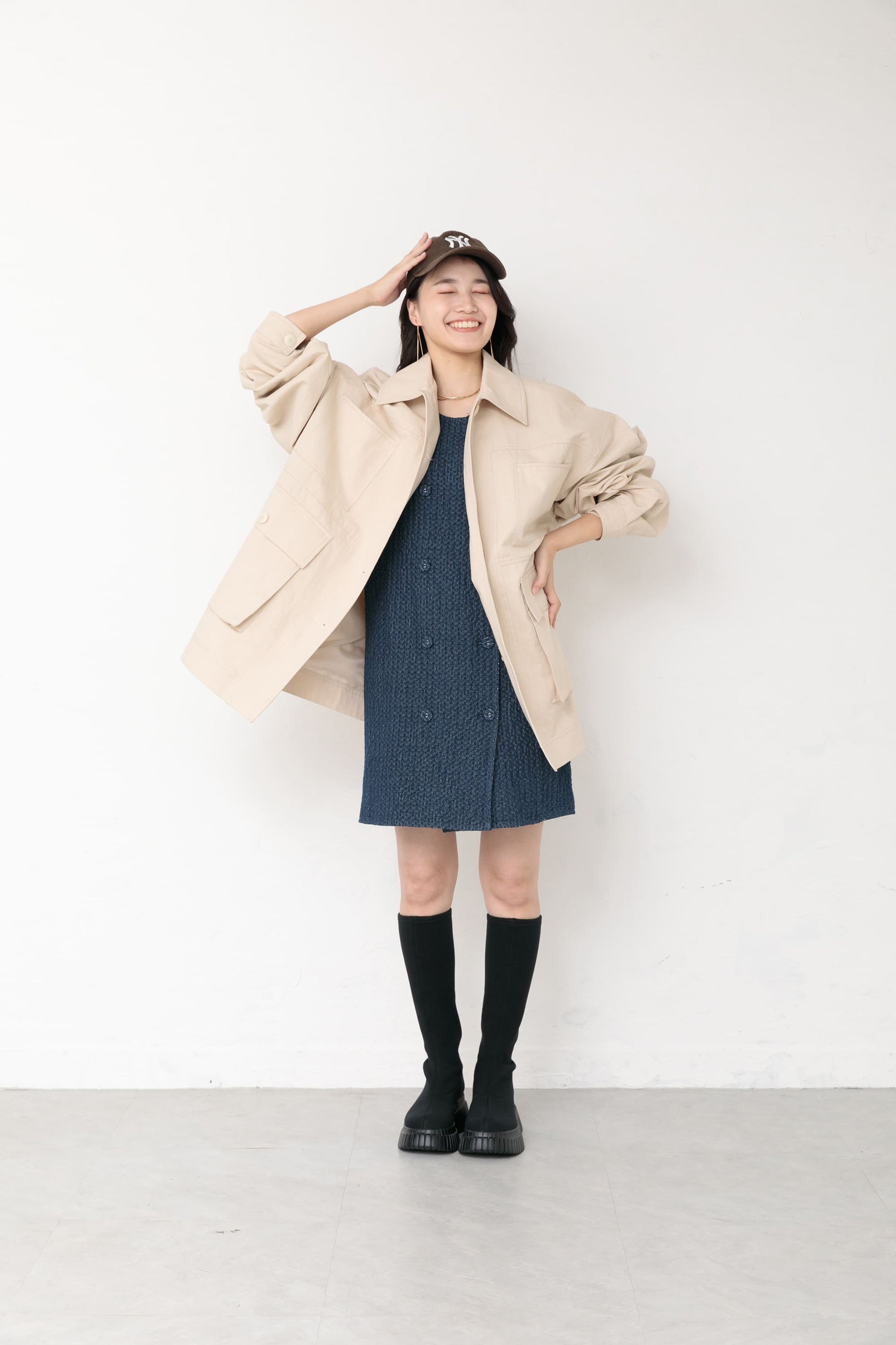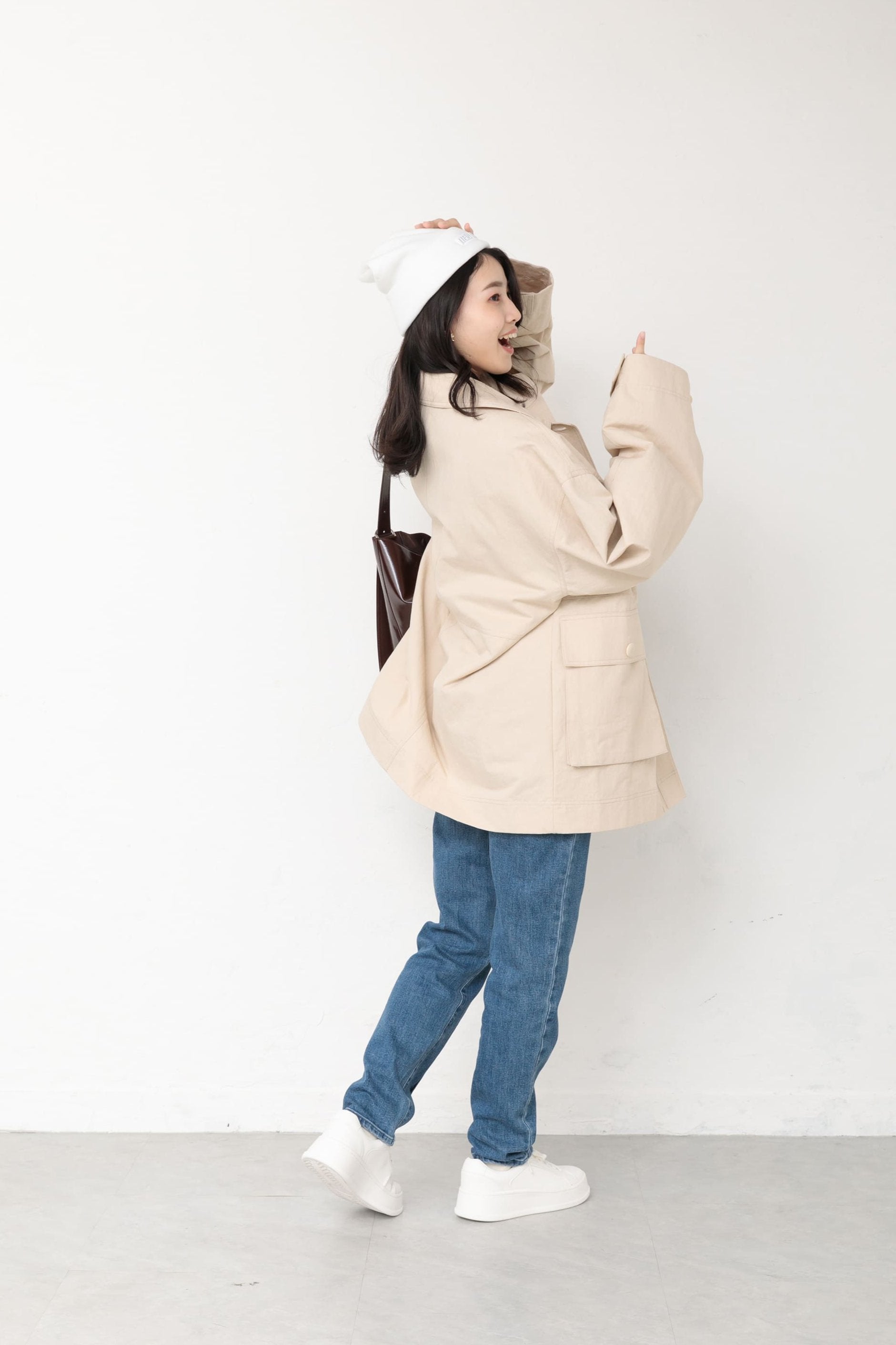 大きめポケットと大きめ襟がポイント。広めの袖口を絞り華奢な手首を出して女性らしく、そのままダボっと着てボーイズライクな着こなし、と両方楽しめるのが魅力。