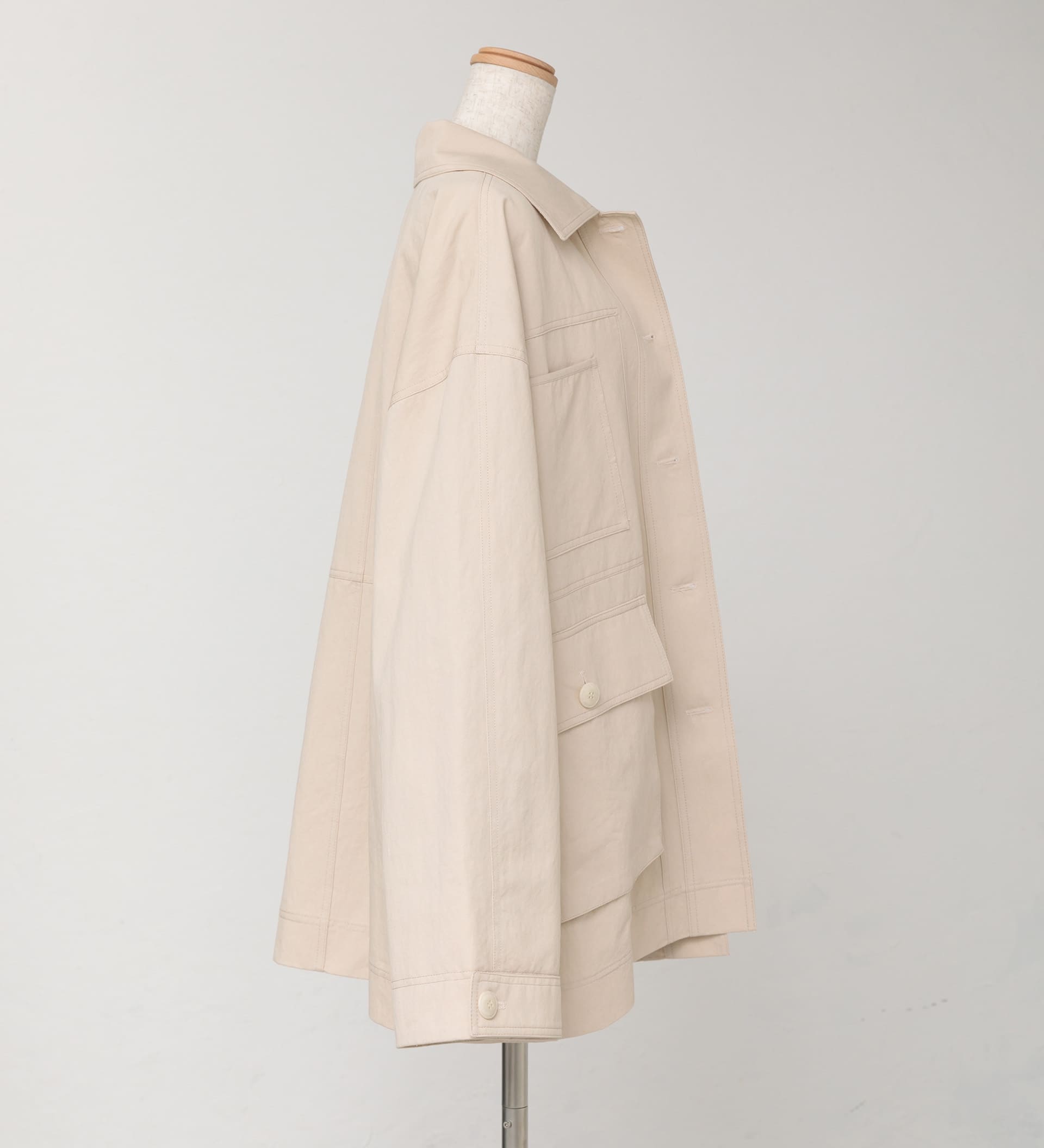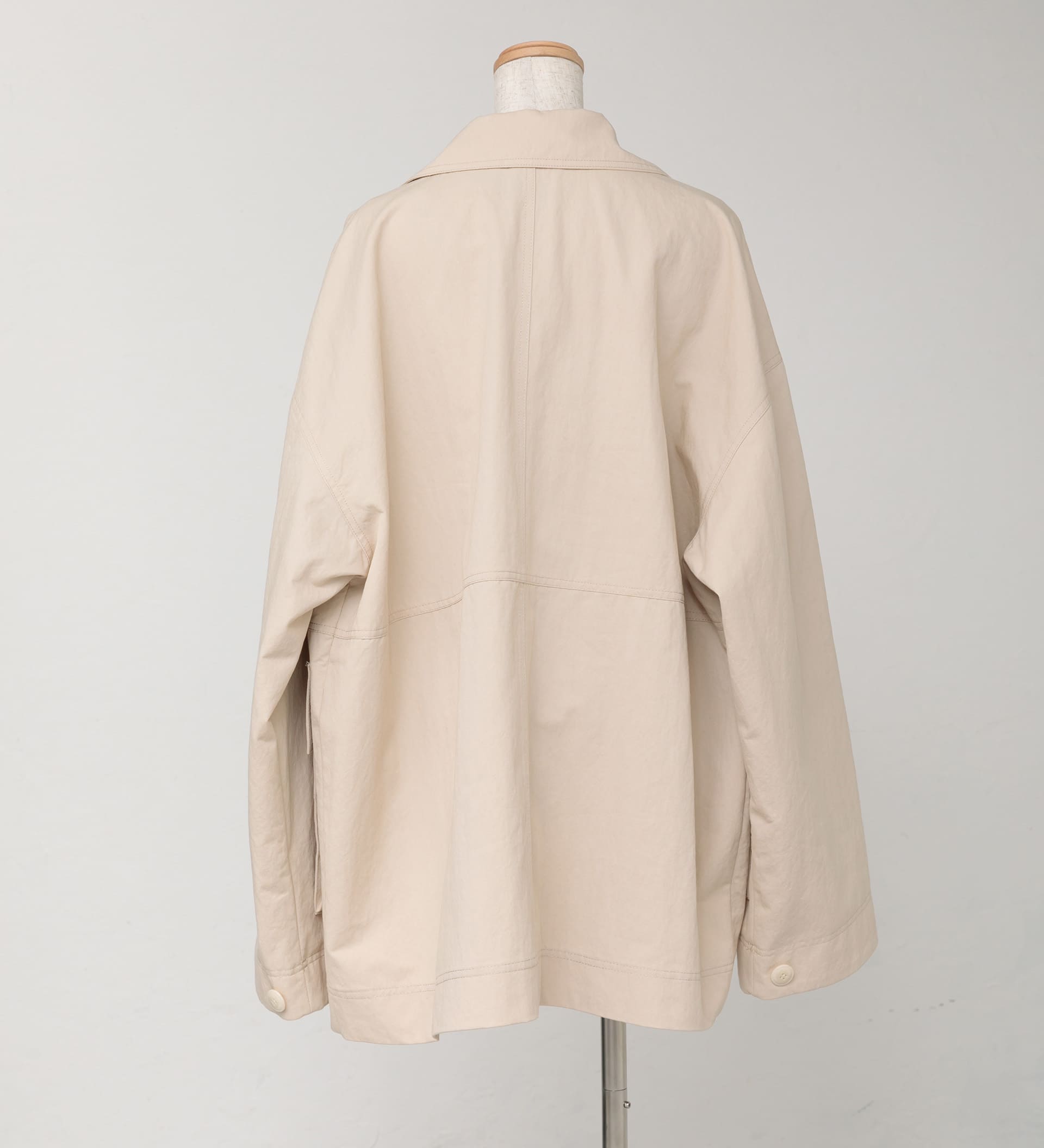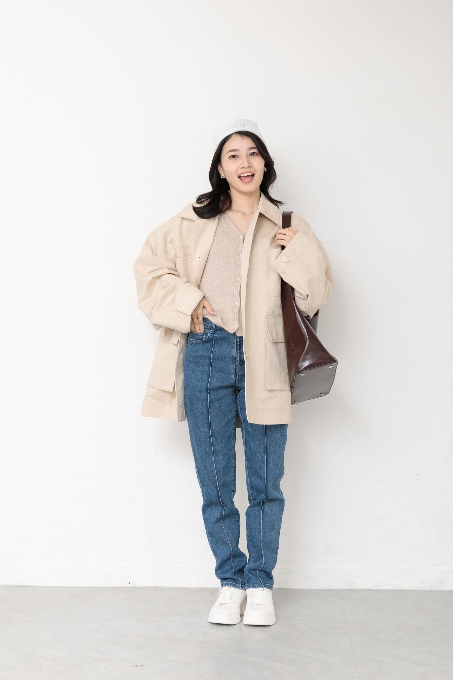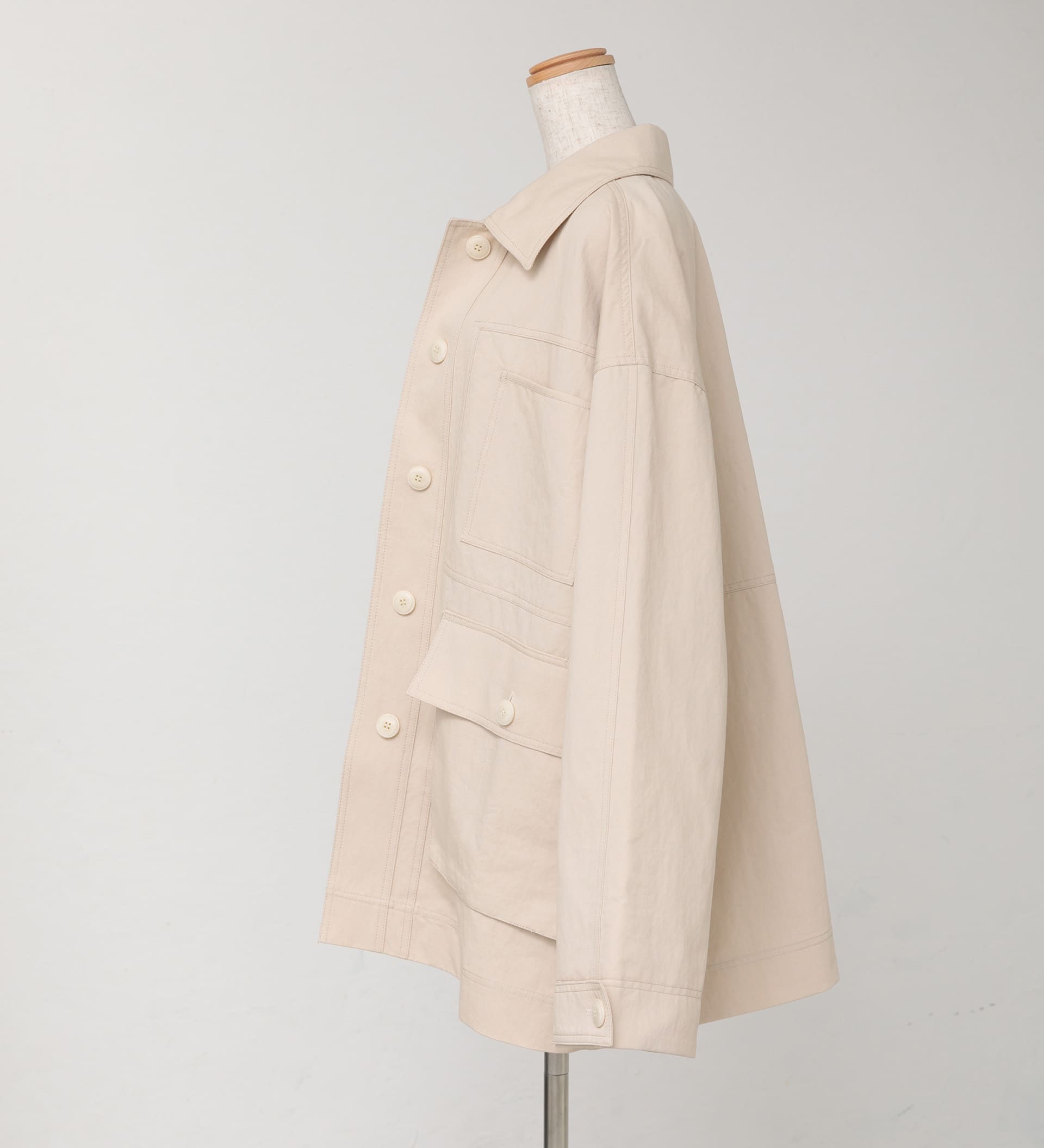 大きめポケットと大きめ襟がポイント。広めの袖口を絞り華奢な手首を出して女性らしく、そのままダボっと着てボーイズライクな着こなし、と両方楽しめるのが魅力。
